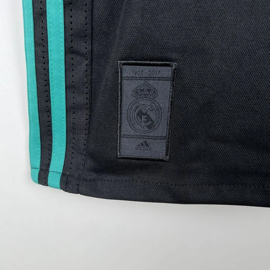 In line with the home and third jerseys, the black base of the Real Madrid 17-18 away shirt gets combined with bright teal details.